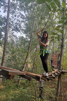“丛林穿越”项目最受大家欢迎,有空中秋千、索道、走钢丝、独木桥、空中云梯、吊桥等一系列的拓展环节。丛林穿越过程中,刘畅作为今年新入职的职工,第一个走上了独木桥的平台上,只见她的双手紧紧地抓住两边的绳子,目光坚定,脚步稳健,顺利完成了第一个挑战项目——独木桥。随后,来到走钢丝的环节,只见她小心翼翼试了试脚感,感觉比较安全,然后小碎步开始向前走。突然,钢丝像秋千似的荡起来,于是她就改变了策略,迈开大步向前走,本来晃动挺厉害的钢丝慢慢静止下来,找到了最佳的方法后,还不忘向后面的同事传授闯关秘籍,最后在她不懈的努力下闯关成功。就在大家纷纷踊跃尝试拓展项目的过程中,发生了一个令人感动的小插曲。机关后勤人员桂淑霞在闯空中云梯环节中,由于体力不支,突然她的双腿从梯子的空隙中跌落下去,卡在梯子中,动弹不得。正在后面闯关的财务科科长宋敬凯看到了这一幕,他不顾自己的安危,飞快跑过去,帮桂淑霞把双腿从空隙中“拔”了出来,使她脱离险境。