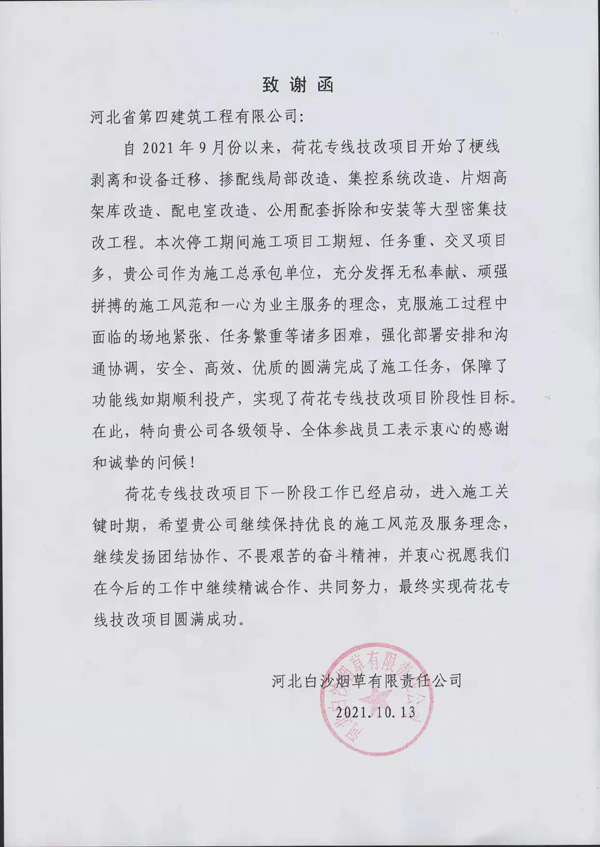一纸致谢函,字字鼓人心!10月13日,三分公司中烟项目部收到业主河北白沙烟草有限责任公司发来的致谢函,感谢项目部克服场地紧张、任务重等诸多困难,圆满完成施工任务,实现了荷花专线技改项目阶段性目标。