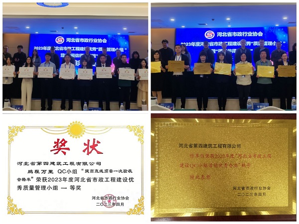 4月18日-20日,2023年度河北省市政工程建设质量管理小组成果交流会在正定召开,第七分公司鹏程万里QC小组发布的《提高直线顶管一次验收合格率》成果获得一等奖,公司荣获2023年度“河北省市政工程建设QC小组活动优秀企业”荣誉。